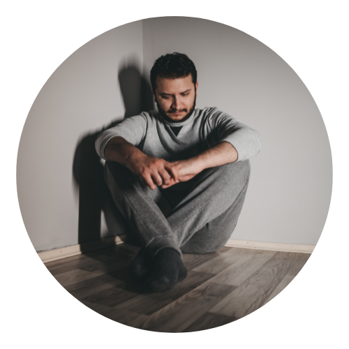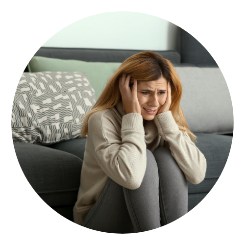 Mulher está sentada no chão sala de estar, encostada no sofá e com as mãos na cabeça, porque está tendo uma crise de ansiedade.