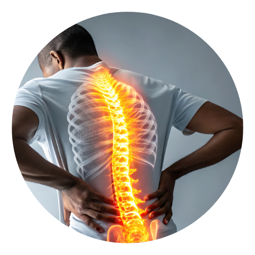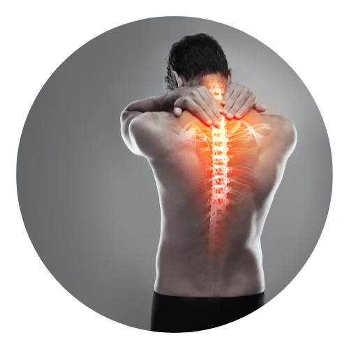 Homem de costas, sem camisa, com as mãos nos ombros e os dedos no início da coluna vertebral. A espinha dorsal está em destaque, iluminada.